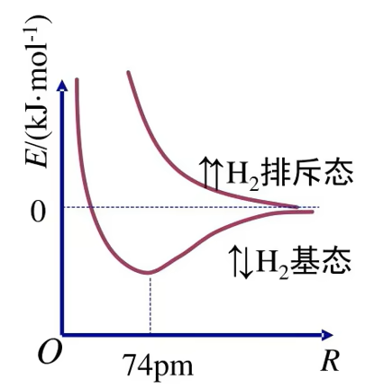 轨道发生重叠,电子在两原子核间出现的机会较大。随着核间距的减小,核间电子出现的机会增大,体系的能量逐渐下降,达到能量最低状态。核间距进一步减小时,两原子间的斥力使体系的能量迅速上升这种排斥作用又将氢原子推回到平衡位置。氢分子的形成过程中能量(主要指势能)随核该间距的变化如图所示 - 若两个氢原子核外电子的自旋方向相同,当它们相互接近时,原子间总是排斥作用占主导地位。所以两个带有自旋方向相同的电子的氢原子不可能形成氢分子
