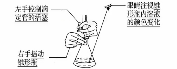- 在锥形瓶下垫一张白纸,左手控制滴定管,右手摇动锥形瓶,眼睛注视锥形瓶溶液颜色变化。摇动时右手握住锥形瓶颈,使溶液单方向不断旋转(左旋、右旋均可),不可前后振动。